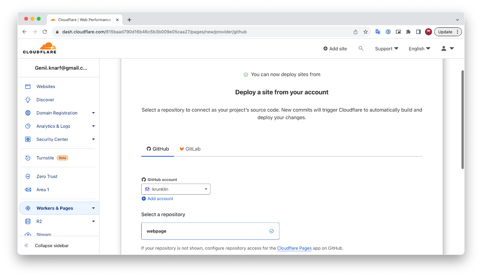 Log in to the Cloudflare dashboard. In Account Home, select Workers & Pages > Create application > Pages > Connect to Git.